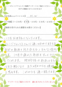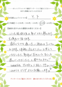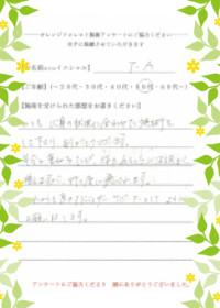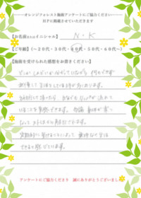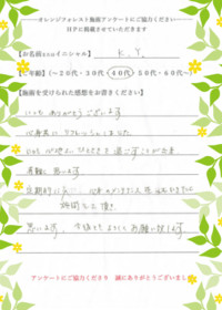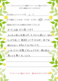 オレンジフォレスト甲子園口にて、施術を受けてくださったお客様の感想です。■Y.Iさま(50代)![]()